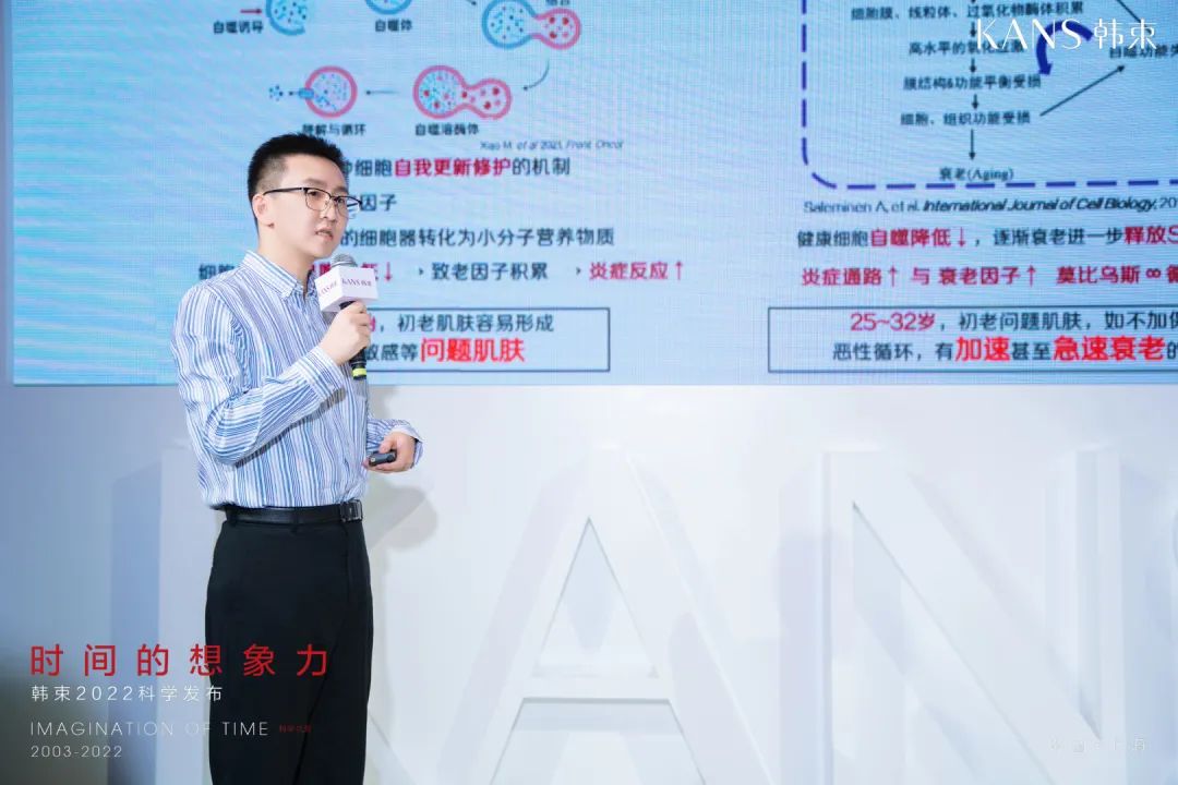 會(huì)議現(xiàn)場,上美集團(tuán)研發(fā)副總裁特別助理陶侃也詳細(xì)介紹了韓束藍(lán)銅肽系列背后的研發(fā)故事。