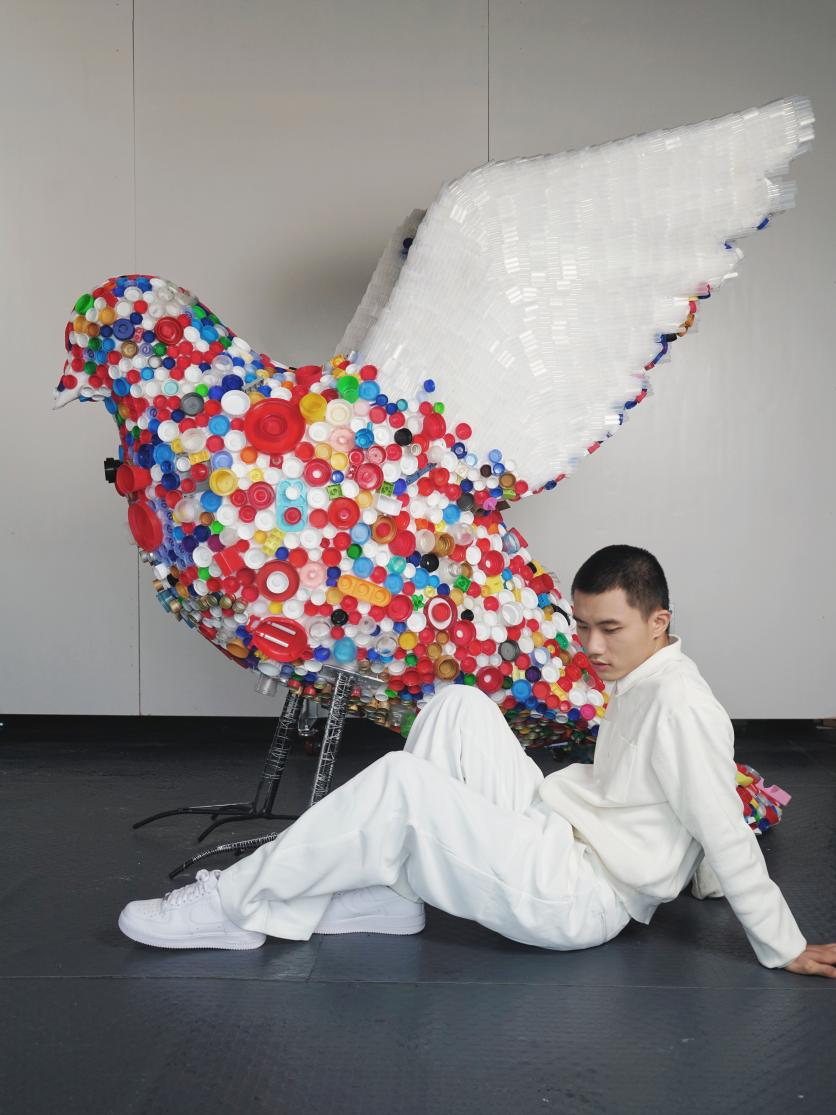 “我希望通過震撼的塑料垃圾堆疊這種暴力的方式,讓人們從視覺上被畫面震撼,從而走進聆聽作品背后的表達,因為塑料污染,世界上的許多生靈正在慢慢消失,而你眼前的這只甘肅柳鶯就是其中一只。”