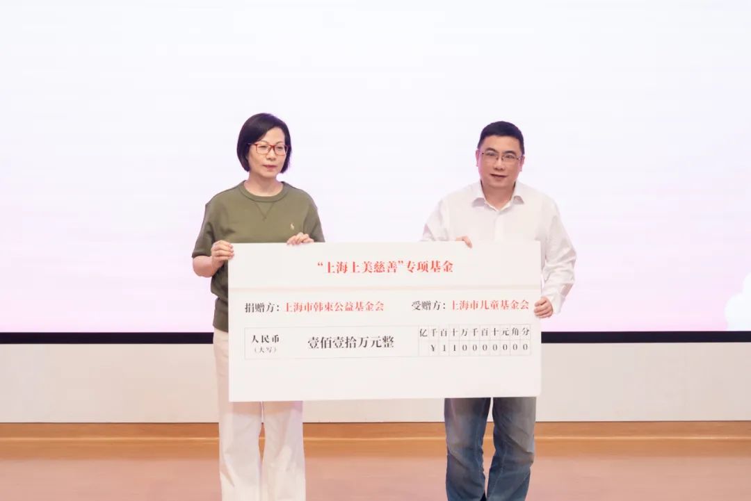 活動現(xiàn)場,上美股份副總裁、韓束基金會理事長俞瑛作為企業(yè)代表,通過韓束基金會向上海市兒童基金會捐贈110萬元,用于“上美慈善專項基金”項目,上海市兒童基金會副理事長陳勇代表市兒基會接受捐贈。