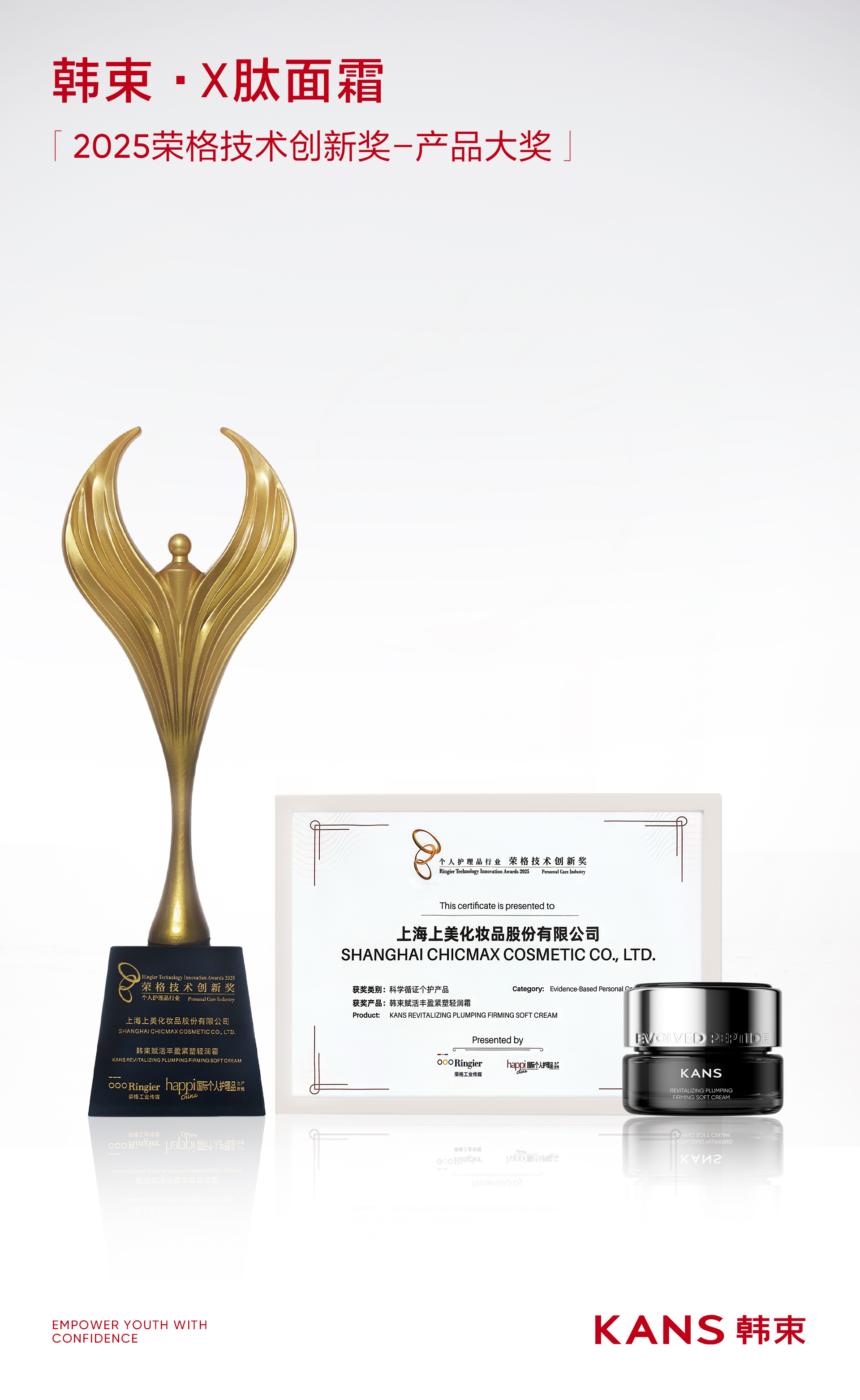 近日,2025PCT個人護理品技術(shù)高峰論壇暨榮格技術(shù)創(chuàng)新獎頒獎典禮在上海舉行。上美股份旗下品牌韓束“X肽面霜”斬獲榮格技術(shù)創(chuàng)新獎-產(chǎn)品大獎,這也是上美繼“青蒿油AN+”、“環(huán)六肽-9”兩項原料獎后獲得的新一項榮格技術(shù)創(chuàng)新獎產(chǎn)品大獎。